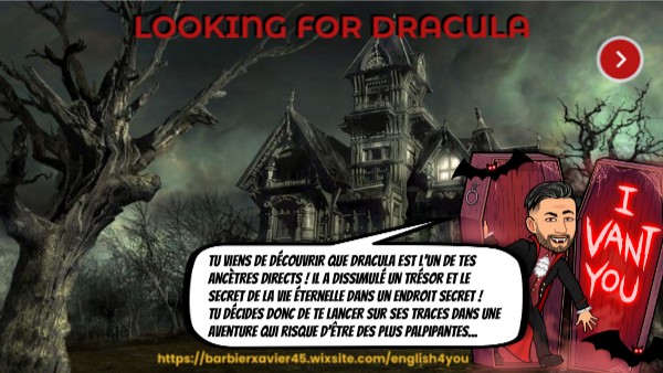 tu viens de découvrir que dracula est l'un de tes ancètres directs ! il a dissimulé un trésor et le secret de la vie éternelle dans un endroit secret ! Tu décides donc de te lancer sur ses traces dans une aventure qui risque d'être des plus palpipantes...