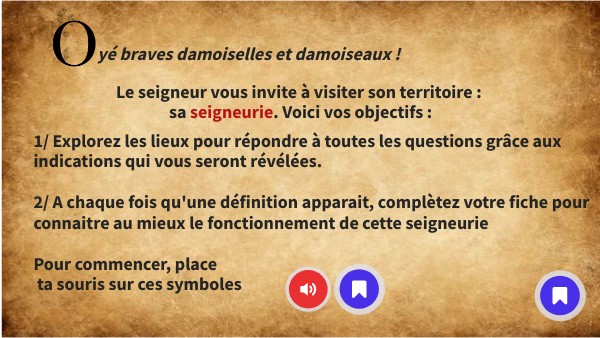 1/ Explorez les lieux pour répondre à toutes les questions grâce aux indications qui vous seront révélées. 2/ A chaque fois qu'une définition apparait, complètez votre fiche pour connaitre au mieux le fonctionnement de cette seigneurie Pour commencer, place ta souris sur ces symboles