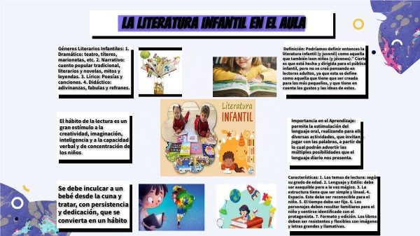 Definición: Podríamos definir entonces la literatura infantil (y juvenil) como aquella que también leen niños (y jóvenes).” Cierto es que está hecha y dirigida para el público infantil, pero no se creó pensando en lectores adultos, ya que esta se define como aquella que tiene que ser creada para los más pequeños, y que tiene en cuenta los gustos y las ideas de estos.