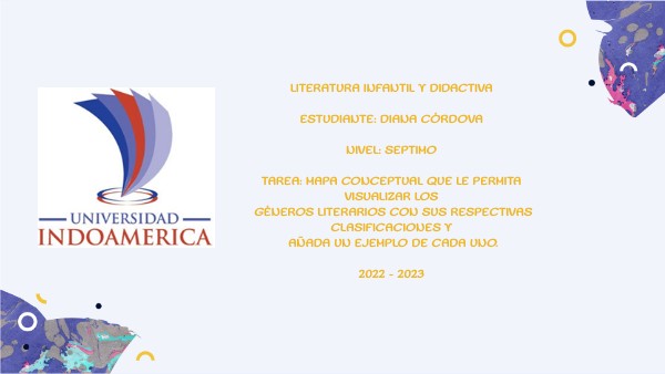 LITERATURA INFANTIL Y DIDACTIVAESTUDIANTE: DIANA CÓRDOVA NIVEL: SEPTIMO TAREA: MAPA CONCEPTUAL QUE LE PERMITA VISUALIZAR LOS GÉNEROS LITERARIOS CON SUS RESPECTIVAS CLASIFICACIONES Y AÑADA UN EJEMPLO DE CADA UNO.2022 – 2023