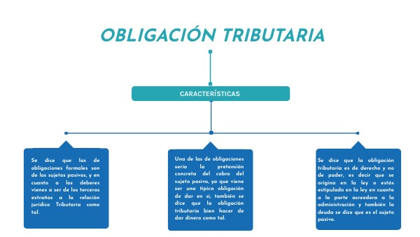 Se dice que la obligación tributaria es de derecho y no de poder, es decir que se origina en la ley o estás estipulado en la ley en cuanto a la parte acreedora a la administración y también la deuda se dice que es el sujeto pasivo.