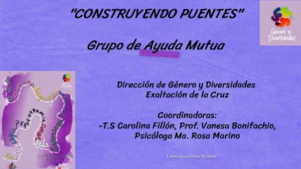# Pertenecemos a la Dirección de Género y Diversidades del distrito de Exaltación de la Cruz.# Formamos parte del programa local “Una Puerta Violeta” que desde diferentes abordajes acompaña, asesora, contiene a las mujeres e identidades diversas en los caminos a las salidas de las situaciones de violencia de género. # Intervenimos en el programa a través de la conformación y la coordinación de UN DISPOSITIVO GRUPAL que llamamos CONSTRUYENDO PUENTES. #Somos profesionales de distintas disciplinas: el campo del arte, la psicología y el trabajo social. Desde esta mirada interdisciplinaria coordinamos los encuentros ,construyendo saberes que posibilitan el abordaje de la complejidad de situaciones que se presentan. #Este dispositivo grupal toma las características de Grupo de Ayuda Mutua (GAM) respondiendo a la línea 1 Eje 2 del Programa provincial Comunidades sin Violencia. GAM: Son espacios de intercambio y encuentro conformados por mujeres y LGTB+ que están atravesando situaciones de violencia de género. Uno de los principales objetivos es visibilizar y desnaturalizar las experiencias de maltrato vívidas, reconocerse en las historias de otras mujeres y LGTB+, e incorporar saberes que les permitan generar estrategias para el fortalecimiento de sus autonomías.