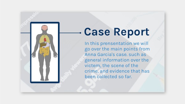 In this prensentation we will go over the main points from Anna Garcia's case. such as general information over the victem, the scene of the crime, and evidence that has been collected so far.