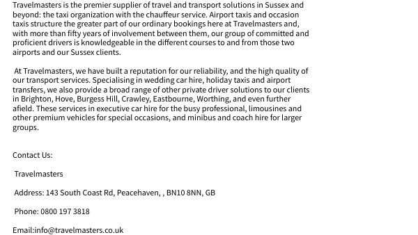 Travelmasters is the premier supplier of travel and transport solutions in Sussex and beyond: the taxi organization with the chauffeur service. Airport taxis and occasion taxis structure the greater part of our ordinary bookings here at Travelmasters and, with more than fifty years of involvement between them, our group of committed and proficient drivers is knowledgeable in the different courses to and from those two airports and our Sussex clients. At Travelmasters, we have built a reputation for our reliability, and the high quality of our transport services. Specialising in wedding car hire, holiday taxis and airport transfers, we also provide a broad range of other private driver solutions to our clients in Brighton, Hove, Burgess Hill, Crawley, Eastbourne, Worthing, and even further afield. These services in executive car hire for the busy professional, limousines and other premium vehicles for special occasions, and minibus and coach hire for larger groups. Contact Us: Travelmasters Address: 143 South Coast Rd, Peacehaven, , BN10 8NN, GB Phone: 0800 197 3818 Email:info@travelmasters.co.uk