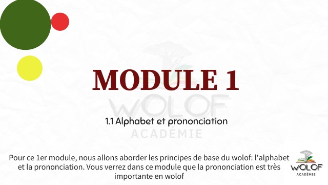 Pour ce 1er module, nous allons aborder les principes de base du wolof: l'alphabet et la prononciation. Vous verrez dans ce module que la prononciation est très importante en wolof