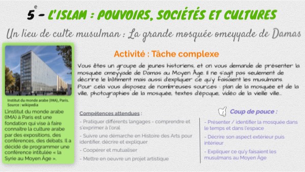 Vous êtes un groupe de jeunes historiens, et on vous demande de présenter la mosquée omeyyade de Damas au Moyen Âge. Il ne s’agit pas seulement de décrire le bâtiment mais aussi d’expliquer ce qu’y faisaient les musulmans.Pour cela vous disposez de nombreuses sources : plan de la mosquée et de la ville, photographies de la mosquée, textes d’époque, vidéo de la vieille ville…