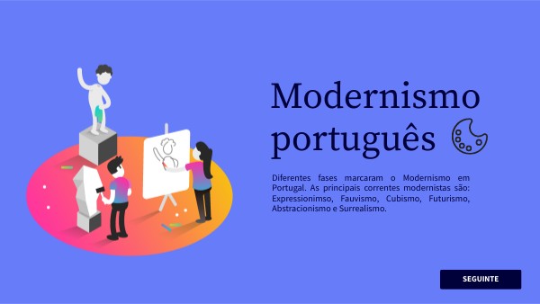 Diferentes fases marcaram o Modernismo em Portugal. As principais correntes modernistas são: Expressionimso, Fauvismo, Cubismo, Futurismo, Abstracionismo e Surrealismo.