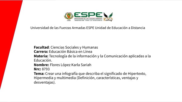 Facultad: Ciencias Sociales y Humanas Carrera: Educación Básica en Línea Materia: Tecnología de la información y la Comunicación aplicadas a la Educación. Nombre: Flores López Karla Sariah Nrc: 8793 Tema: Crear una infografía que describa el significado de Hipertexto, Hipermedia y multimedia (Definición, características, ventajas y desventajas).