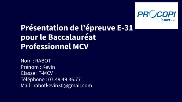 Nom : RABOT Prénom : Kevin Classe : T-MCV Téléphone : 07.49.49.36.77 Mail : rabotkevin30@gmail.com