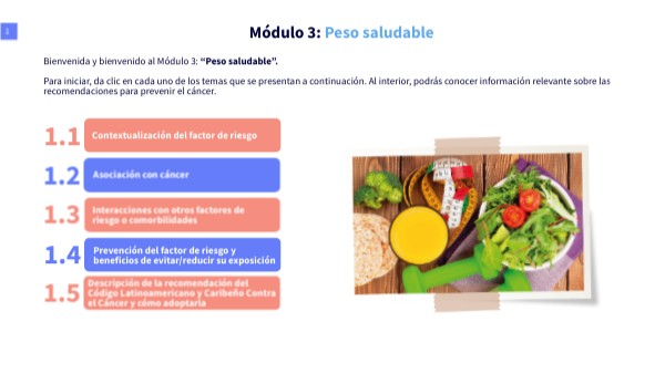 Bienvenida y bienvenido al Módulo 3: “Peso saludable”. Para iniciar, da clic en cada uno de los temas que se presentan a continuación. Al interior, podrás conocer información relevante sobre las recomendaciones para prevenir el cáncer.