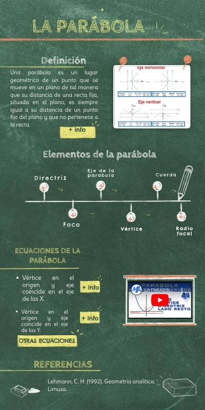 Una parábola es un lugar geométrico de un punto que se mueve en un plano de tal manera que su distancia de una recta fija, situada en el plano, es siempre igual a su distancia de un punto fijo del plano y que no pertenece a la recta.