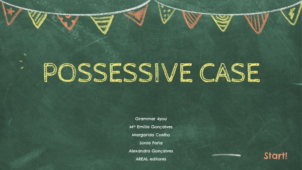 O caso possessivo é usado para indicar posse (Mary's house - the house of Mary) ou uma relação próxima entre duas pessoas (Mary's parents - the parents of Mary). É usado para pessoas e animais. Exemplos: - The family's name is Denver. (=the name of the family) - Their cat's whiskers are very long.(=the whiskers of the cat)