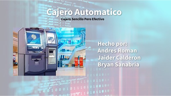 Estamos presentando un cajero automatico debido a que queremos mostrar que a través de la programación básica podemos crear proyectos para el bien de la comunidad y avanzar cada día más mejorando los sistemas. La problemática o más bien el propósito de realizar este proyecto surge de un problema que llegó a afectar a muchas personas, cuando una aplicación como lo es nequi que hace parte de Bancolombia se separó de la misma e hizo que muchas personas buscarán una segunda opción, fue aquí cuando decidimos investigar cómo es el manejo y funcionamiento de un cajero en una escala mucho mejor. Nuestro cajero esta centralizado en retirar efectivo y depositar este mismo. Cada boton fue programado vinculandolo a la interfaz que fue creada desde cero pero siempre teniendo la idea y respetando como son los cajeros en los bancos o las plazas.