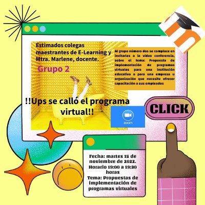 Al grupo número dos se complace en invitarles a la vídeo conferencia, sobre el tema: Propuesta de implementación de programas virtuales para una institución educativa o para una empresa u organización que necesite ofrecer capacitación a sus empleados