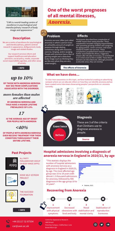 To raise more awareness on this topic, we have looked at creating an advertising campain where we can educate others on how they can identify anorexia and we have created some interviews showcasing peoples' perspectives on anorexia currently.