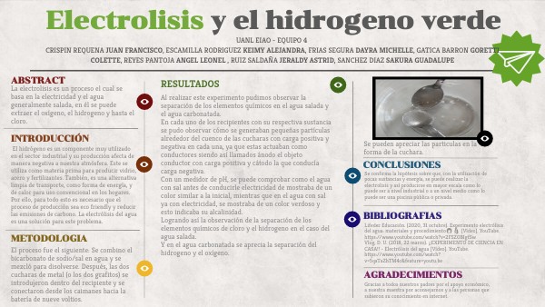 La electrolisis es un proceso el cual se basa en la electricidad y el agua generalmente salada, en él se puede extraer el oxígeno, el hidrogeno y hasta el cloro. Pero en nuestro caso, solo se vio el proceso y nuestro punto principal fue el famoso hidrogeno verde, el cual a partir de este proceso se puede crear y tenemos con esto una de las fuentes de combustible ecológico más sanos ya que se crea con el líquido que más abunda, el agua. El proceso que se realizó en esta investigación es uno de los más seguros y fáciles de realizar, simplemente utilizando productos con los que la mayoría ya contamos en casa; solamente utilizando un recipiente con agua mezclada con sal o bicarbonato de sodio, utilizando dos varillas ya sean de metal o de grafico para conducir la electricidad de una batería por medio de dos cables tipo caimán dentro del agua y asi este empiece a generar partículas de agua. Nuestra hipótesis, en resumidas cuentas, fue comprobada y siento un total éxito, con esto podemos comprobar la facilidad y lo rentable que podría ser el uso de hidrogeno verde en las empresas, ya que, es un proceso tan simple que hasta nosotros pudimos realizarlo en casa, sin necesidad de un laboratorio.