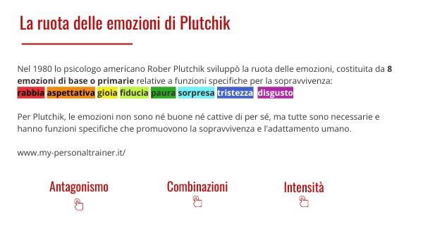 Nel 1980 lo psicologo americano Rober Plutchik sviluppò la ruota delle emozioni, costituita da 8 emozioni di base o primarie relative a funzioni specifiche per la sopravvivenza: rabbia aspettativa gioia fiducia paura sorpresa tristezza disgusto. Per Plutchik, le emozioni non sono né buone né cattive di per sé, ma tutte sono necessarie e hanno funzioni specifiche che promuovono la sopravvivenza e l'adattamento umano. www.my-personaltrainer.it/
