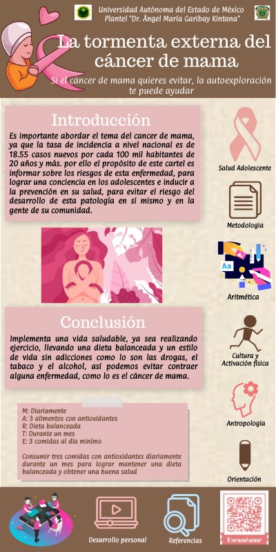 Es importante abordar el tema del cancer de mama, ya que la tasa de incidencia a nivel nacional es de 18.55 casos nuevos por cada 100 mil habitantes de 20 años y más. por ello el propósito de este cartel es informar sobre los riesgos de esta enfermedad, para lograr una conciencia en los adolescentes e inducir a la prevención en su salud, para evitar el riesgo del desarrollo de esta patología en sí mismo y en la gente de su comunidad.