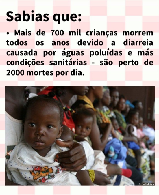 • Mais de 700 mil crianças morrem todos os anos devido a diarreia causada por águas poluídas e más condições sanitárias - são perto de 2000 mortes por dia.