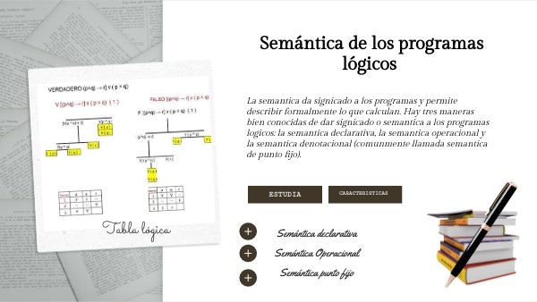 La semantica da signicado a los programas y permite describir formalmente lo que calculan. Hay tres maneras bien conocidas de dar signicado o semantica a los programas logicos: la semantica declarativa, la semantica operacional y la semantica denotacional (comunmente llamada semantica de punto fijo).