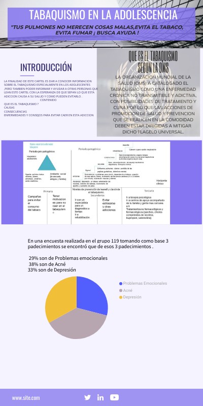 En una encuesta realizada en el grupo 119 tomando como base 3 padecimientos se encontró que de esos 3 padecimientos . 29% son de Problemas emocionales 38% son de Acné 33% son de Depresión