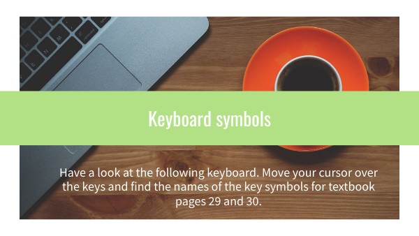 Have a look at the following keyboard. Move your cursor over the keys and find the names of the key symbols for textbook pages 29 and 30.
