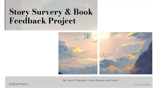 "On this project, we took a survery of questions revoled around stories from our classmates and viewed the majority of similarities and differences of taste, We also chose a certain book recommanded by one of the individual classmastes from the survey.