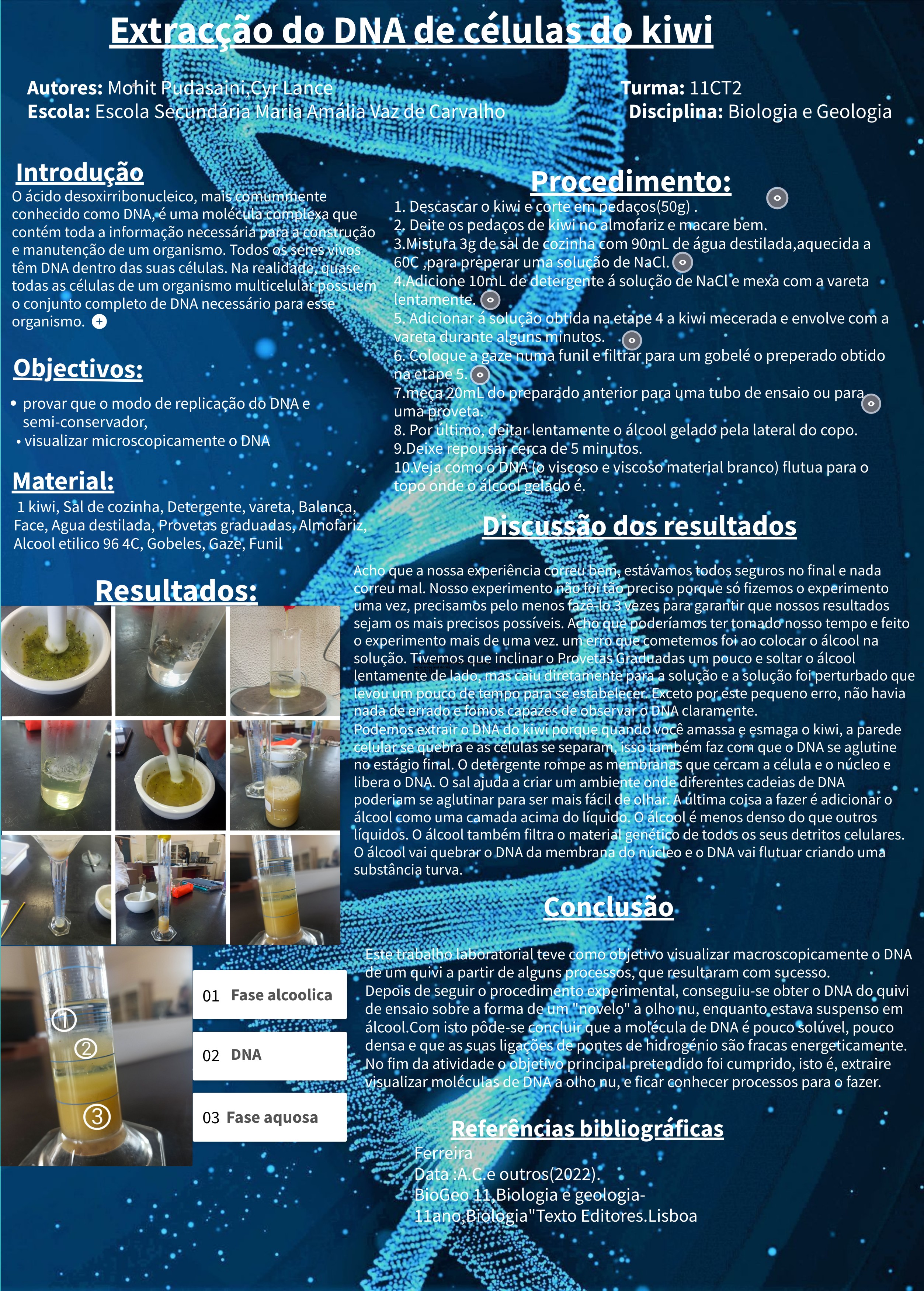 Este trabalho laboratorial teve como objetivo visualizar macroscopicamente o DNA de um quivi a partir de alguns processos, que resultaram com sucesso. Depois de seguir o procedimento experimental, conseguiu-se obter o DNA do quivi de ensaio sobre a forma de um "novelo" a olho nu, enquanto estava suspenso em álcool.Com isto pôde-se concluir que a molécula de DNA é pouco solúvel, pouco densa e que as suas ligações de pontes de hidrogénio são fracas energeticamente. No fim da atividade o objetivo principal pretendido foi cumprido, isto é, extraire visualizar moléculas de DNA a olho nu, e ficar conhecer processos para o fazer.