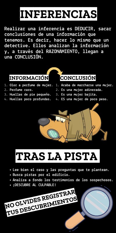 Realizar una inferencia es DEDUCIR, sacar conclusiones de una información que tenemos. Es decir, hacer lo mismo que un detective. Ellos analizan la información y, a través del RAZONAMIENTO, llegan a una CONCLUSIÓN.