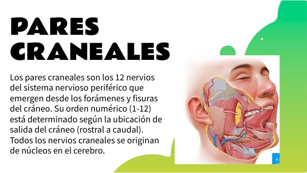 Los pares craneales son los 12 nervios del sistema nervioso periférico que emergen desde los forámenes y fisuras del cráneo. Su orden numérico (1-12) está determinado según la ubicación de salida del cráneo (rostral a caudal). Todos los nervios craneales se originan de núcleos en el cerebro.