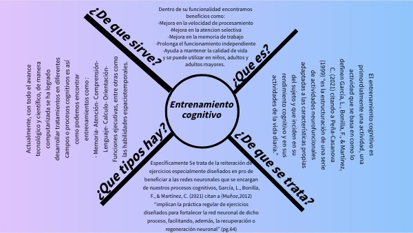Específicamente Se trata de la reiteración de ejercicios especialmente diseñados en pro de beneficiar a las redes neuronales que se encargan de nuestros procesos cognitivos, García, L., Bonilla, F., & Martínez, C. (2021) citan a (Muñoz,2012) “implican la práctica regular de ejercicios diseñados para fortalecer la red neuronal de dicho proceso, facilitando, además, la recuperación o regeneración neuronal” (pg.64)