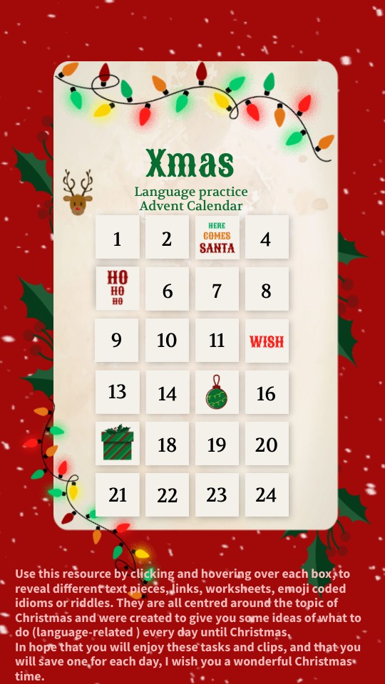 Use this resource by clicking and hovering over each box, to reveal different text pieces, links, worksheets, emoji coded idioms or riddles. They are all centred around the topic of Christmas and were created to give you some ideas of what to do (language-related ) every day until Christmas. In hope that you will enjoy these tasks and clips, and that you will save one for each day, I wish you a wonderful Christmas time.