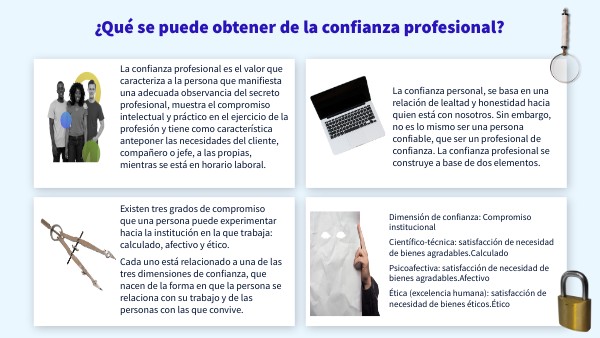 La confianza personal, se basa en una relación de lealtad y honestidad hacia quien está con nosotros. Sin embargo, no es lo mismo ser una persona confiable, que ser un profesional de confianza. La confianza profesional se construye a base de dos elementos.