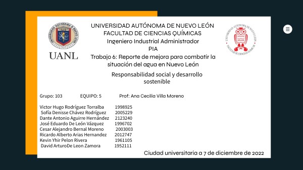 UNIVERSIDAD AUTÓNOMA DE NUEVO LEÓN FACULTAD DE CIENCIAS QUÍMICAS Ingeniero Industrial Administrador PIA Trabajo 6: Reporte de mejora para combatir la situación del agua en Nuevo León