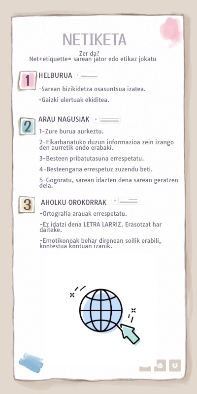 -Ortografia arauak errespetatu. -Ez idatzi dena LETRA LARRIZ. Erasotzat har daiteke. -Emotikonoak behar direnean soilik erabili, kontestua kontuan izanik.