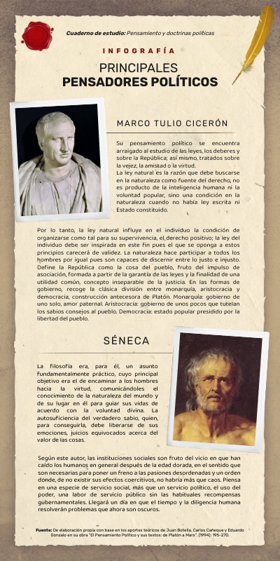 Su pensamiento político se encuentra arraigado al estudio de las leyes, los deberes y sobre la República; así mismo, tratados sobre la vejez, la amistad o la virtud.