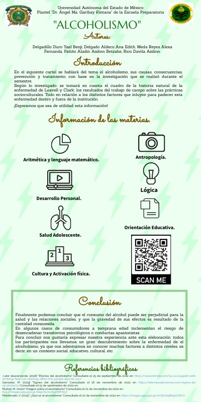 En el siguiente cartel se hablará del tema el alcoholismo, sus causas, consecuencias, prevención y tratamiento; con base en la investigación que se realizó durante el semestre.Según lo investigado; se tomará en cuenta el cuadro de la historia natural de la enfermedad de Leavell y Clark; los resultados del trabajo de campo sobre las prácticas socioculturales. Todo en relación a los distintos factores que inluyen para padecer esta enfermedad dentro y fuera de la institución. ¡Esperamos que sea de utilidad esta información!