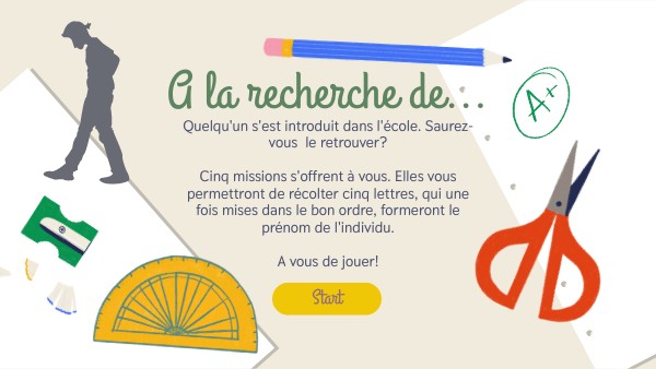 Quelqu'un s'est introduit dans l'école. Saurez-vous le retrouver? Cinq missions s'offrent à vous. Elles vous permettront de récolter cinq lettres, qui une fois mises dans le bon ordre, formeront le prénom de l'individu. A vous de jouer!