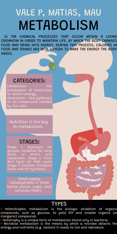 Is the chemical processes that occur within a living organism in order to maintain life, by which the body changes food and drink into energy. During this process, calories in food and drinks mix with oxygen to make the energy the body needs.