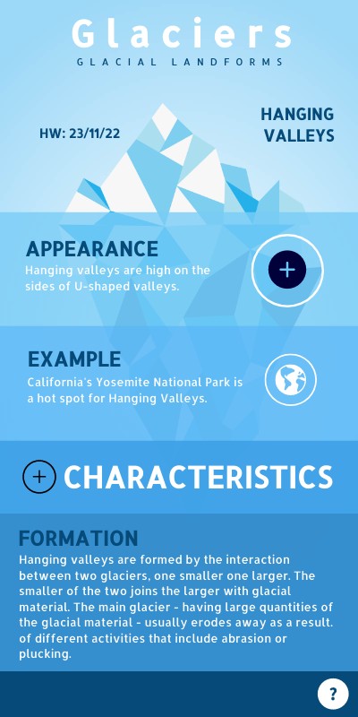 Hanging valleys are formed by the interaction between two glaciers, one smaller one larger. The smaller of the two joins the larger with glacial material. The main glacier - having large quantities of the glacial material - usually erodes away as a result. of different activities that include abrasion or plucking.