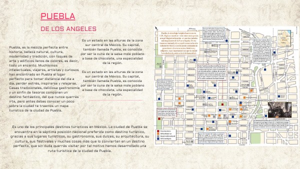 Puebla, es la mezcla perfecta entre historia, belleza natural, cultura, modernidad y tradición, con toques de arte y edificios llenos de colores, es decir, todo un encanto. Muchísimos intelectuales, viajeros, artistas y curiosos han encontrado en Puebla el lugar perfecto para tomar distancia del día a día, perder estrés, inspirarse y relajarse. Casas tradicionales, deliciosa gastronomía y un sinfín de tesoros componen un destino fantástico, del que nunca querrás irte, pero antes debes conocer un poco sobre la ciudad te traemos un mapa turístico de la ciudad de Puebla.