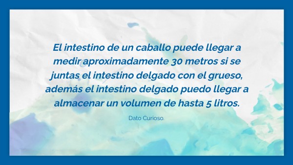 El intestino de un caballo puede llegar a medir aproximadamente 30 metros si se juntas el intestino delgado con el grueso, además el intestino delgado puedo llegar a almacenar un volumen de hasta 5 litros.