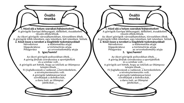 1. Húzd alá a helyes szavakat/kifejezéseket! A görögök Európa délnyugati, délkeleti, északkeleti részén éltek/élnek. Az ókori görögök városállamokban, törzsekben éltek. A görögök több istenben, egy istenben, két istenben hittek. 2. Kösd össze a neveket a megfelelő tudományokkal! Hérodotosz a matematika atyja Hippokrátesz a történetírás atyja Pitagorász az orvostudomány atyja 3. Igaz/hamis?