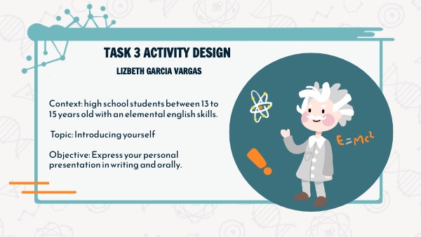 Context: high school students between 13 to 15 years old with an elemental english skills. Topic: Introducing yourself Objective: Express your personal presentation in writing and orally.