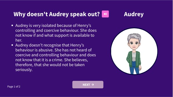 - Audrey is very isolated because of Henry’s controlling and coercive behaviour. She does not know if and what support is available to her.