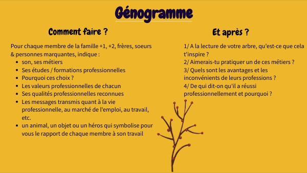 1/ A la lecture de votre arbre, qu'est-ce que cela t'inspire ? 2/ Aimerais-tu pratiquer un de ces métiers ? 3/ Quels sont les avantages et les inconvénients de leurs professions ?4/ De qui dit-on qu'il a réussi professionnellement et pourquoi ?
