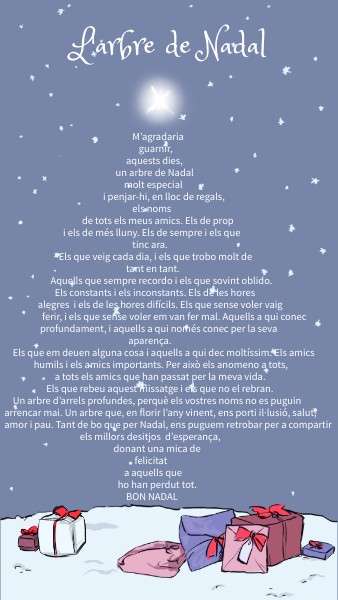 M’agradaria guarnir, aquests dies, un arbre de Nadal molt especial i penjar-hi, en lloc de regals, els noms de tots els meus amics. Els de prop i els de més lluny. Els de sempre i els que tinc ara. Els que veig cada dia, i els que trobo molt de tant en tant. Aquells que sempre recordo i els que sovint oblido. Els constants i els inconstants. Els de les hores alegres i els de les hores difícils. Els que sense voler vaig ferir, i els que sense voler em van fer mal. Aquells a qui conec profundament, i aquells a qui només conec per la seva aparença. Els que em deuen alguna cosa i aquells a qui dec moltíssim. Els amics humils i els amics importants. Per això els anomeno a tots, a tots els amics que han passat per la meva vida. Els que rebeu aquest missatge i els que no el rebran. Un arbre d’arrels profundes, perquè els vostres noms no es puguin arrencar mai. Un arbre que, en florir l’any vinent, ens porti il·lusió, salut, amor i pau. Tant de bo que per Nadal, ens puguem retrobar per a compartir els millors desitjos d’esperança, donant una mica de felicitat a aquells que ho han perdut tot. BON NADAL