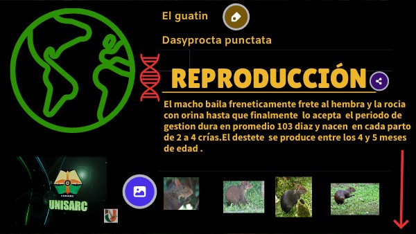 El macho baila freneticamente frete al hembra y la rocia con orina hasta que finalmente lo acepta el periodo de gestion dura en promedio 103 diaz y nacen en cada parto de 2 a 4 crías.El destete se produce entre los 4 y 5 meses de edad .