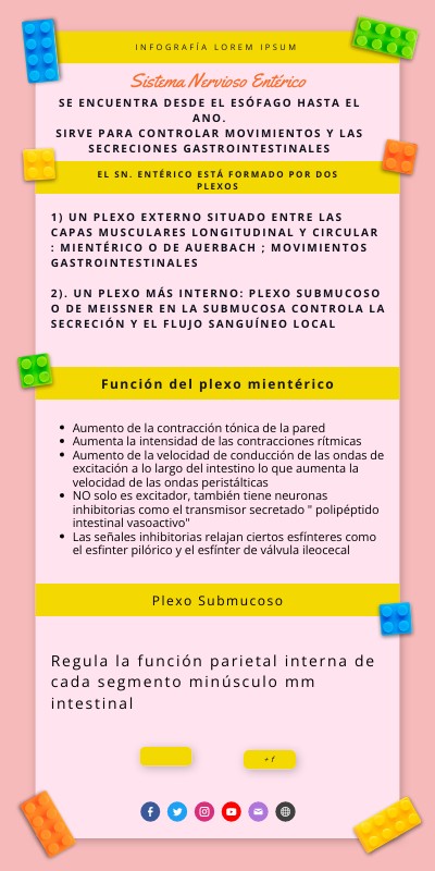 1) Un plexo externo situado entre las capas musculares longitudinal y circular : Mientérico o de Auerbach ; Movimientos gastrointestinales2). Un plexo más interno: Plexo submucoso o de Meissner en la submucosa controla la secreción y el flujo sanguíneo local