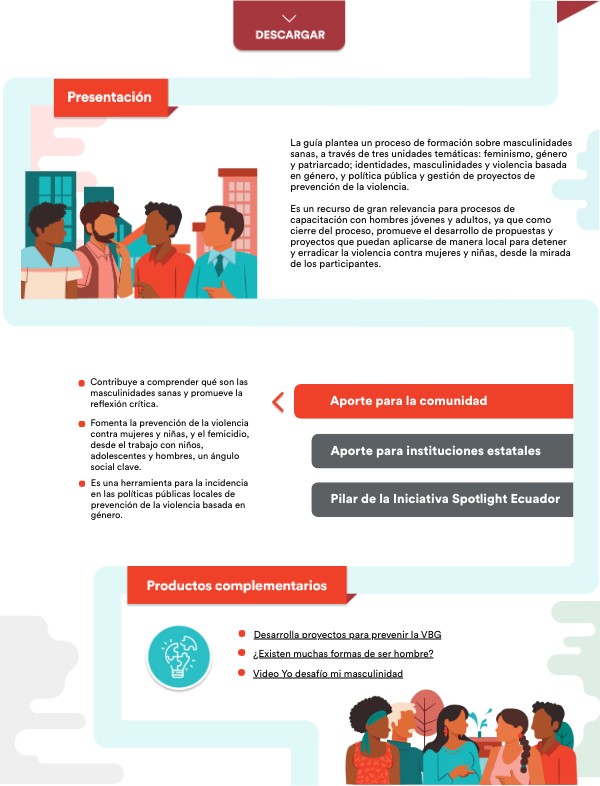 La guía plantea un proceso de formación sobre masculinidades sanas, a través de tres unidades temáticas: feminismo, género y patriarcado; identidades, masculinidades y violencia basada en género, y política pública y gestión de proyectos de prevención de la violencia. Es un recurso de gran relevancia para procesos de capacitación con hombres jóvenes y adultos, ya que como cierre del proceso, promueve el desarrollo de propuestas y proyectos que puedan aplicarse de manera local para detener y erradicar la violencia contra mujeres y niñas, desde la mirada de los participantes.